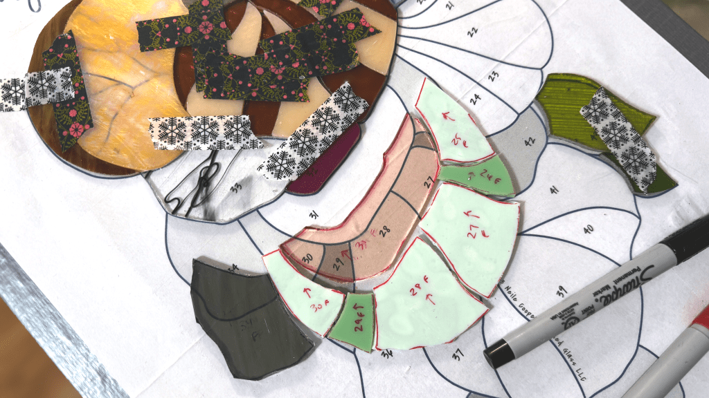 In the pic above, I finished grinding a sliver of hot pink and the clear with black scribbles. I was just starting to fit and grind the clear champagne glass. Taping as I finish grinding pieces helps keep me sane since the pieces shift so easily. You can always grind away the glass but you can’t add it back on.