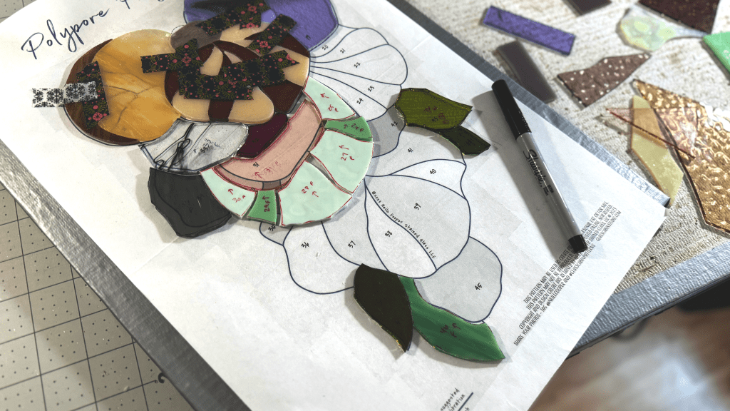 I always love seeing the chaos of rough cut glass turn into smooth, form fitted pieces. Creating stained glass has a lot of mental blocks that I climb over… I’m always second guessing my glass choice until I see the piece held up to the light for the first time, I constantly worry the pieces will never fit since they start out so wonky, and then when I start soldering all I can see is a big mess from the flux until it’s cleaned.